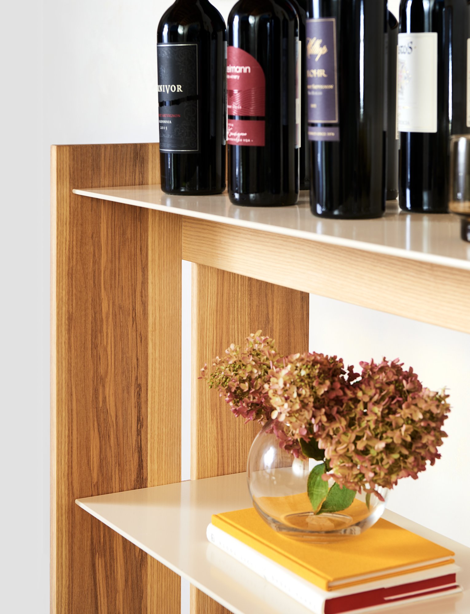 The Tract Shelf is an honest and rational piece with highly useful functionality. Wooden trusses create a graphic side detail, and span the shelves generous length. They support a slim, contrasting metal shelf that is equally suitable for books, objects, and more.